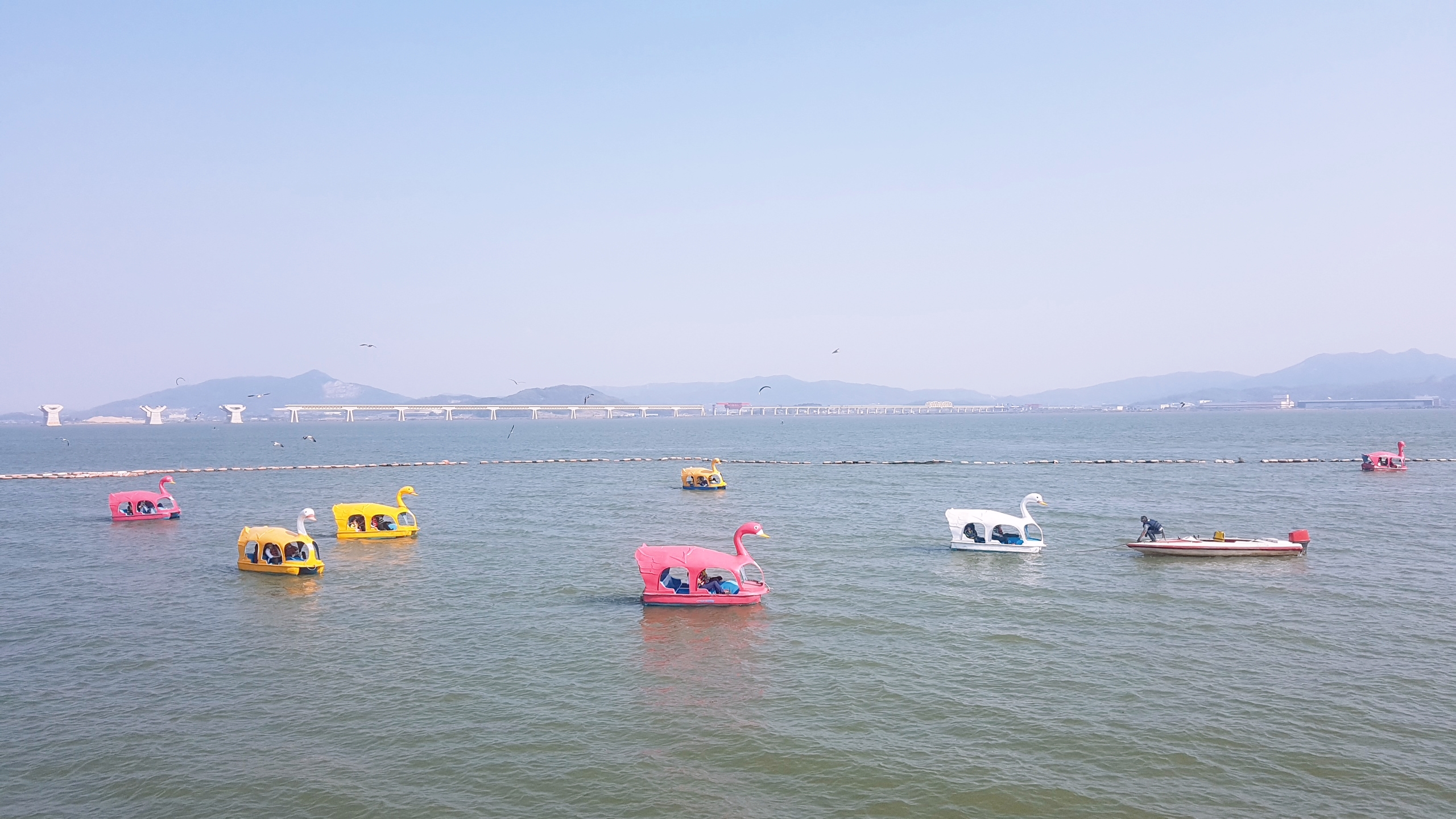 바닷가에선 오리배를 타며 즐거운 휴일을 즐기고 있는 사람들의 모습이 보였습니다.