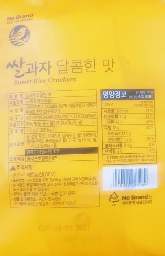 노브랜드 쌀과자 후면부에 상세 정보란입니다.